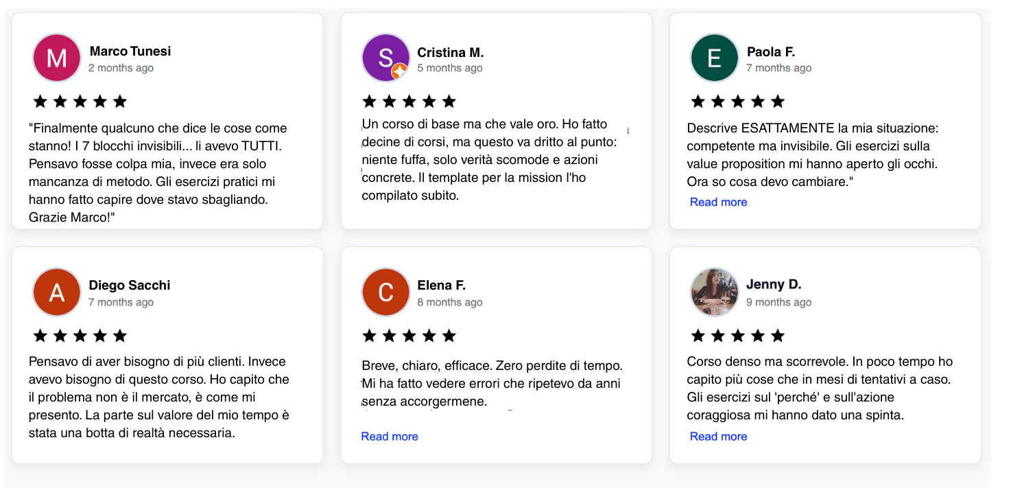 Grazie Marco per aver creato qualcosa di davvero utile e completo. Si vede che c'è esperienza vera dietro, non solo teoria da guru. Investimento ripagato in 3 settimane.